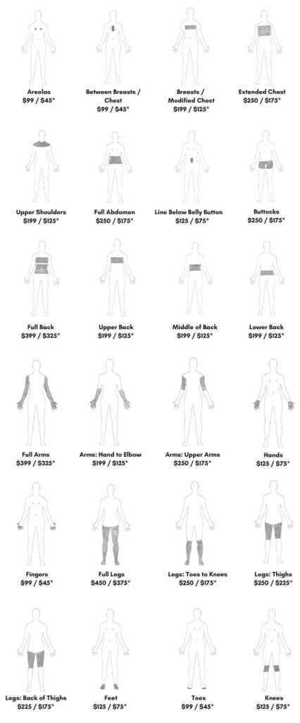 Our pricing structure is straightforward and gender-neutral. We offer single treatment pricing and special discounts for multiple areas. Here’s a quick look at our flexible options: